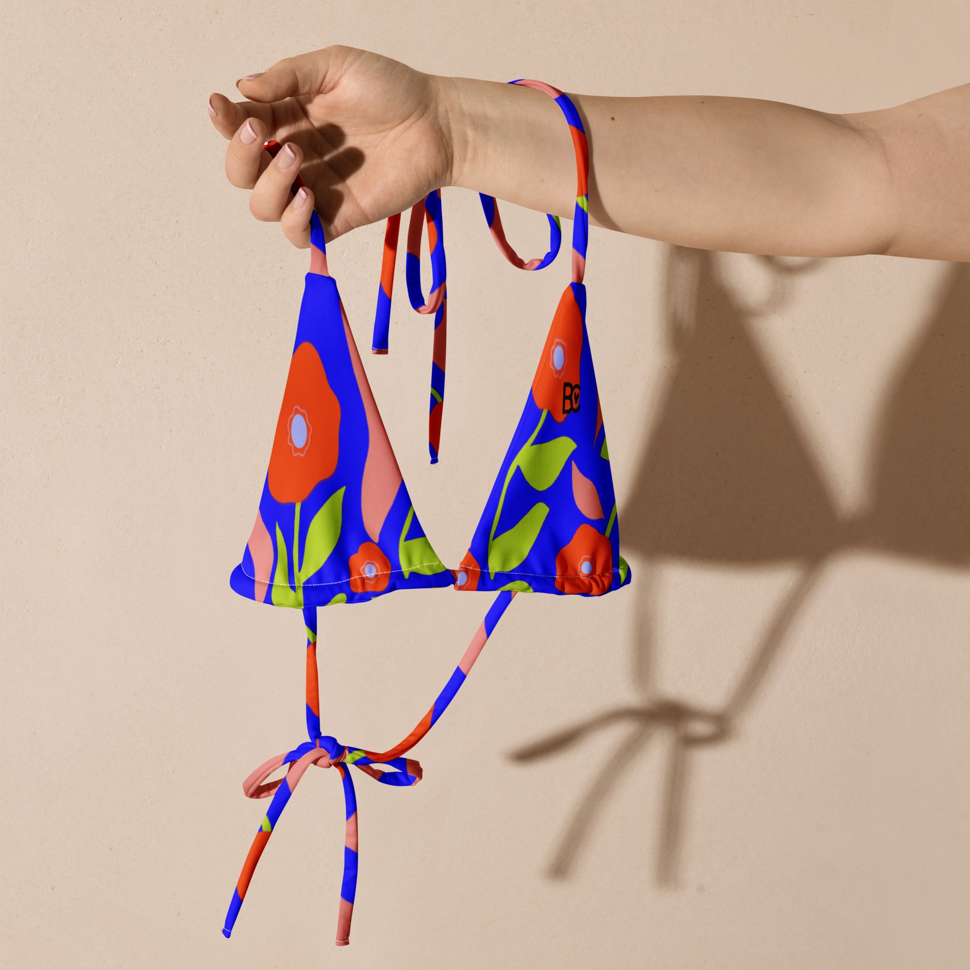 Este top de bikini es ideal para tus días de playa, piscina o simplemente para crear un look veraniego único. Está hecho con tela reciclada, tiene protección solar UPF 50+ y sus tiritas se ajustan como tú quieras — ¡lo puedes amarrar de varias formas para que lo hagas tuyo! 💦✨