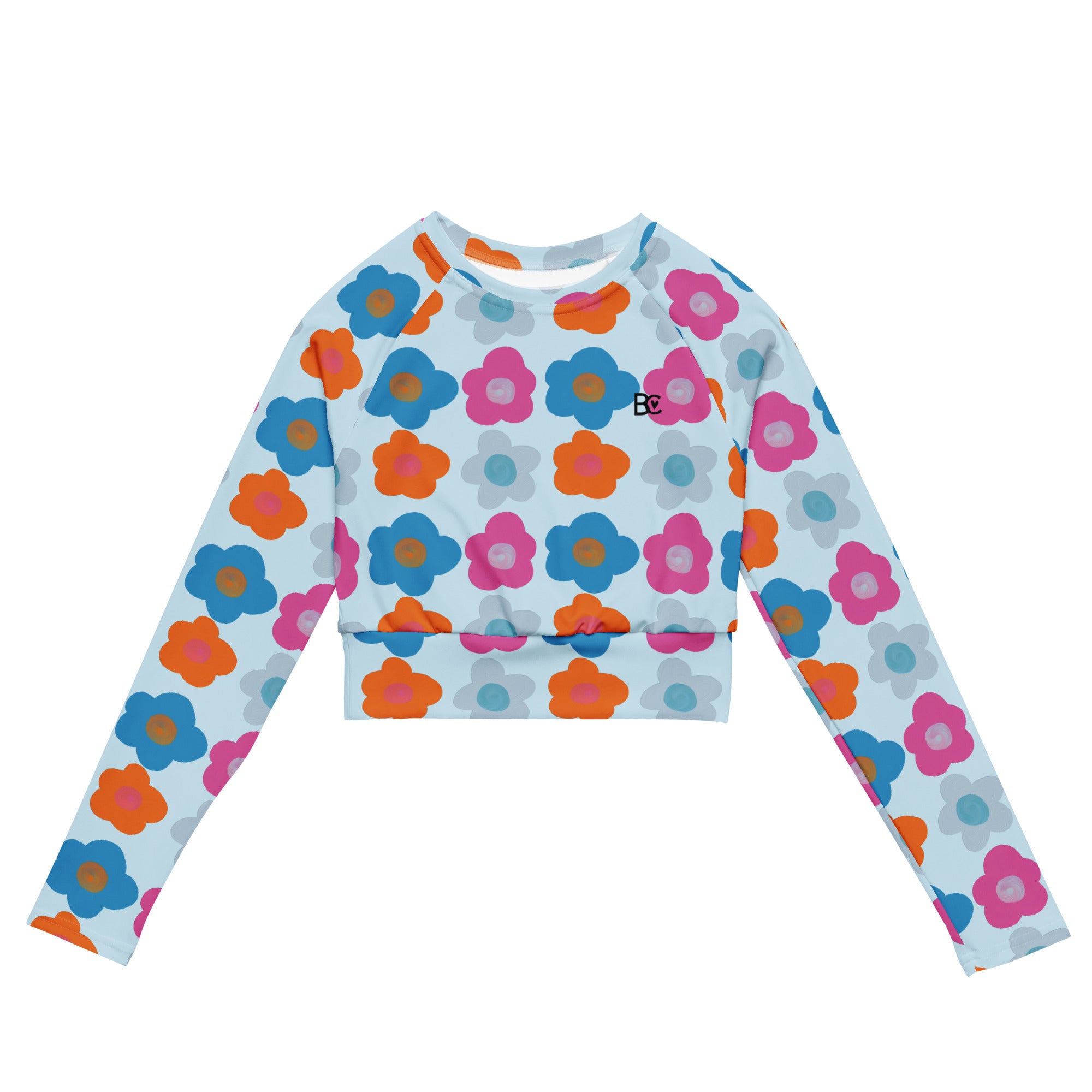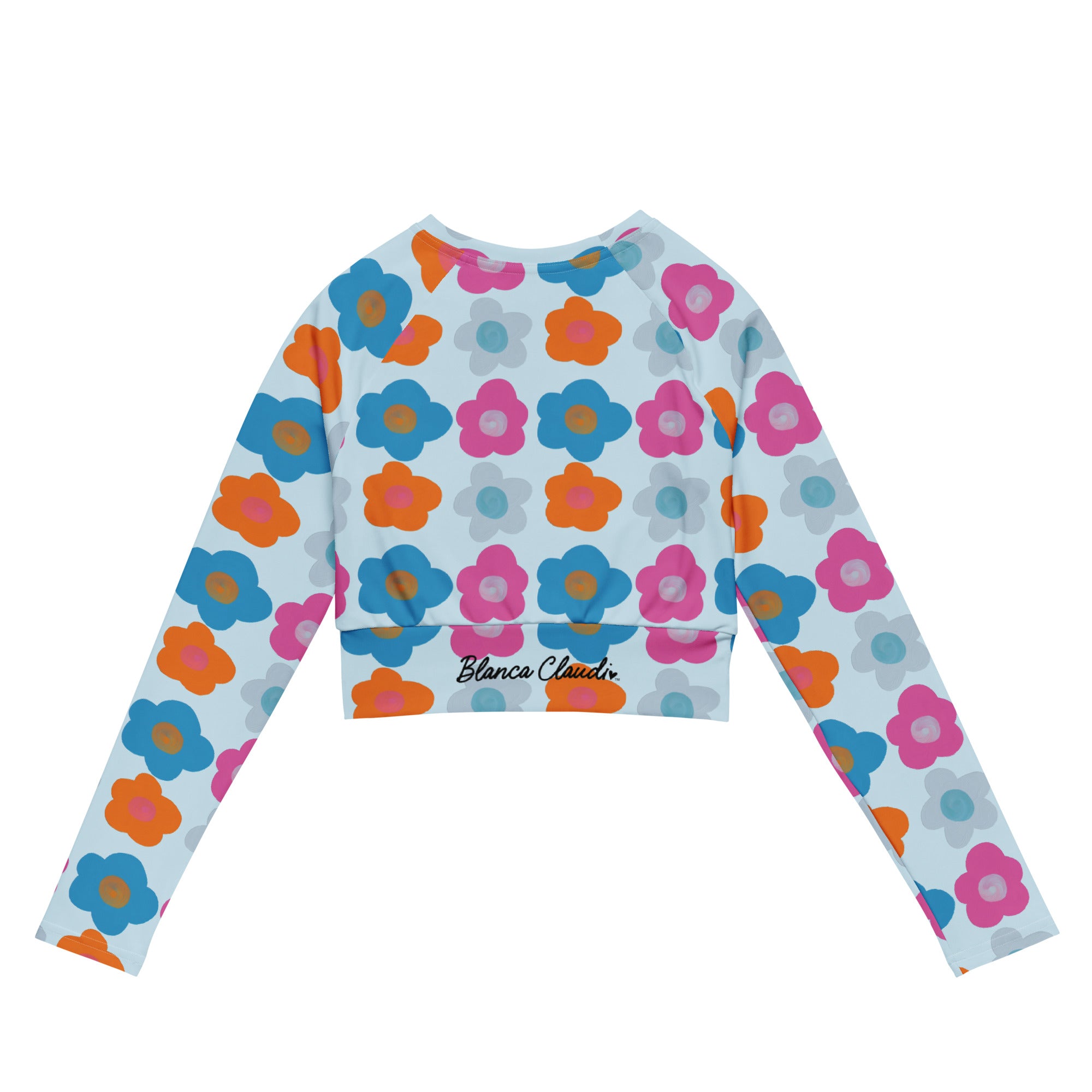 This long-sleeve crop top is made of recycled polyester and elastane, making it an eco-friendly choice for swimming, sports, or athleisure outfits. The crop top has a tear-away care label and a wide, double-layered waistline band for a comfortable fit.